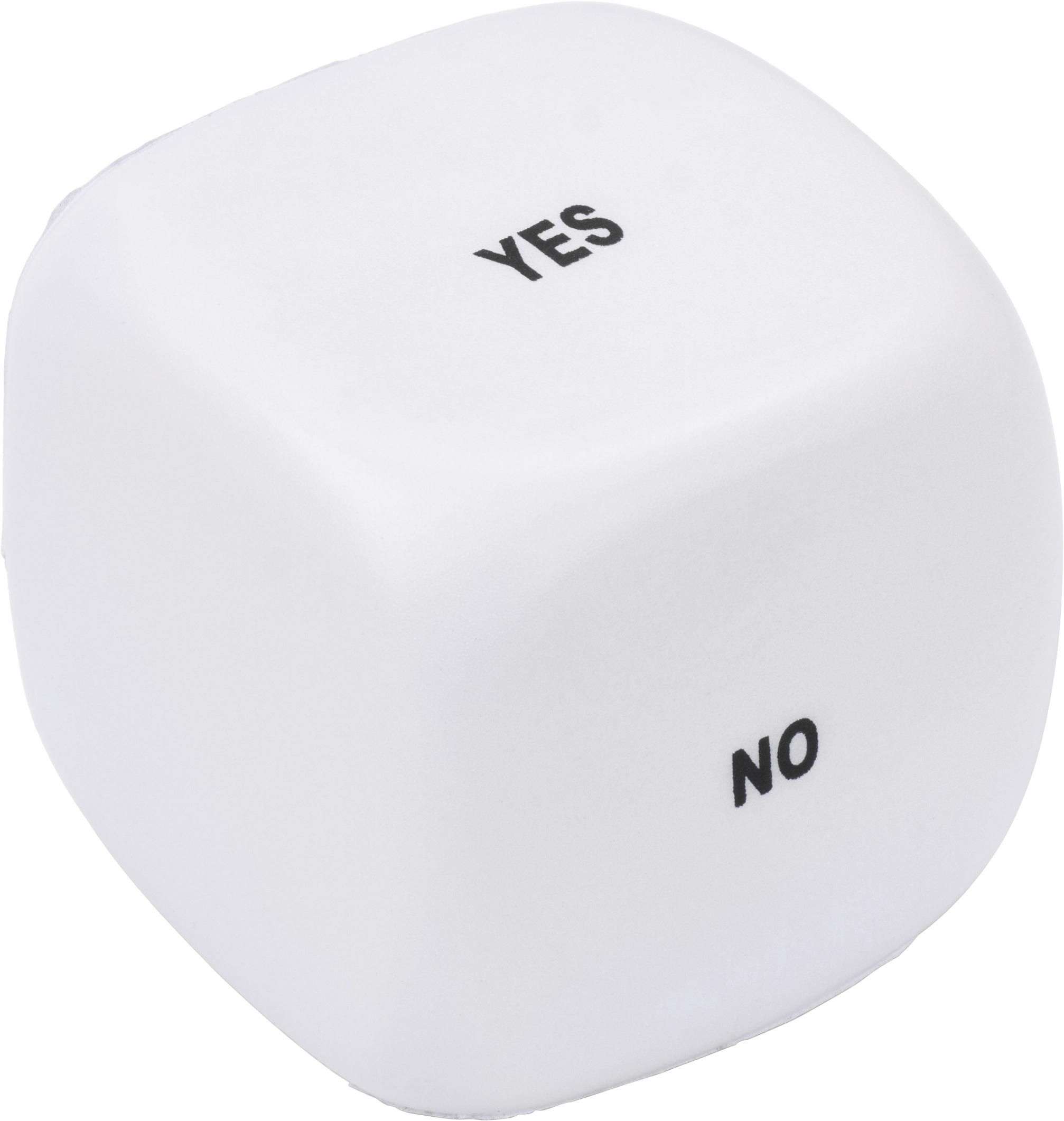 Antistress a forma di cubo decision maker, personalizzabile su di un lato, in PU. Gli articoli antistress possono essere stampati solo nei colori nero, bianco, oro o argento.