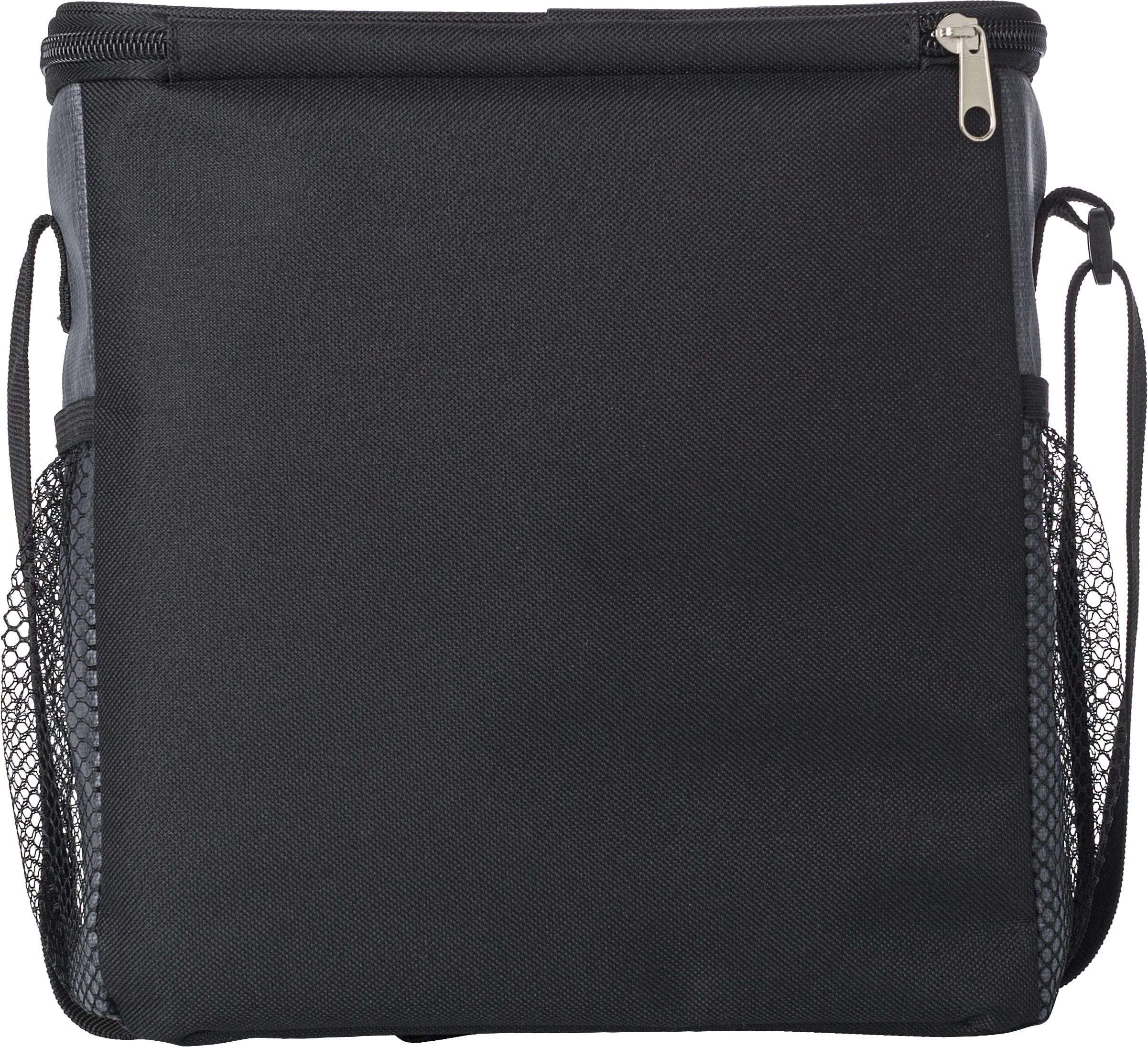 Borsa termica, con tasca anteriore con zip e scomparti retati sull'altro lato, interno rivestito con una pellicola refrigerante, tracolla regolabile, in PU