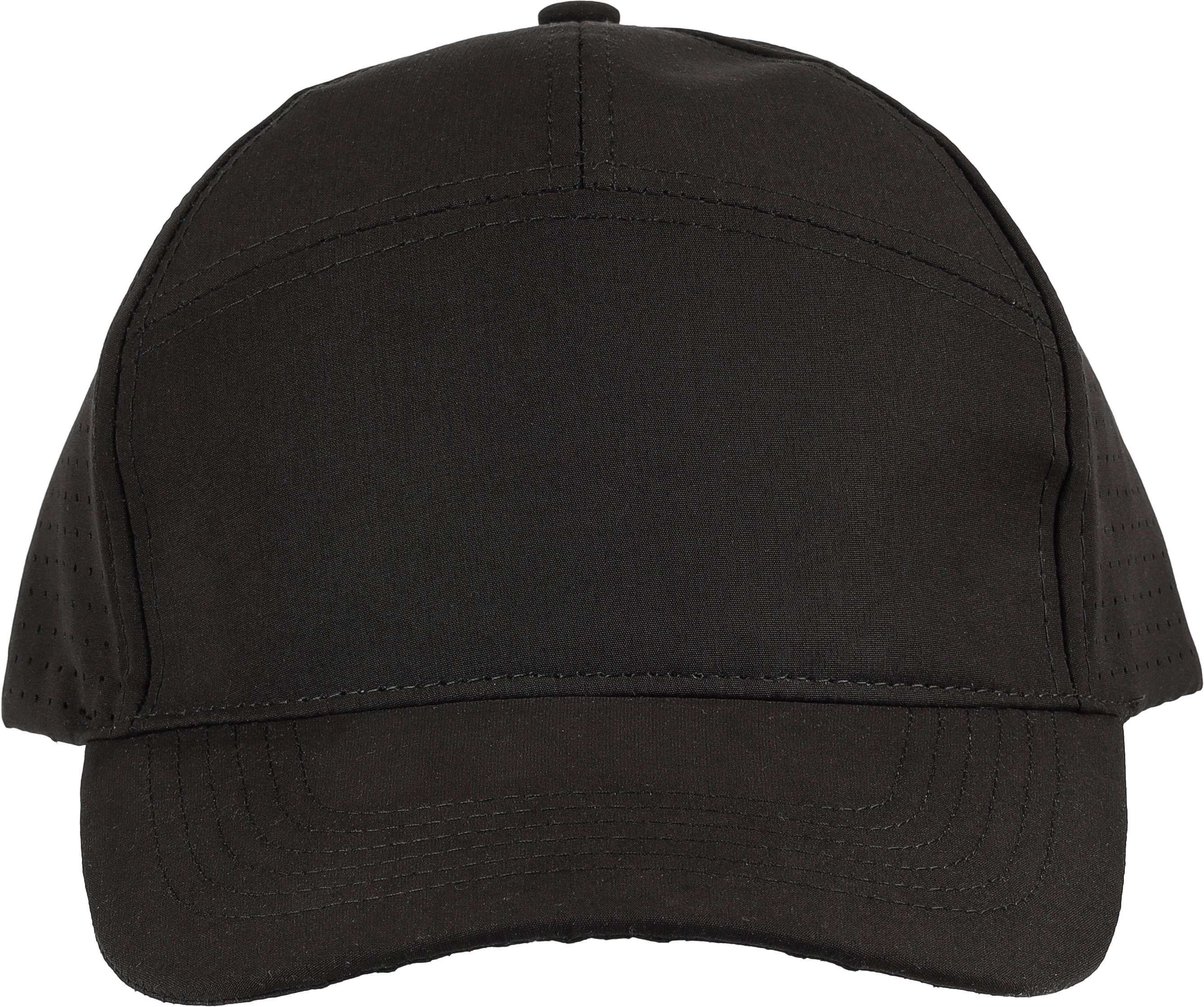 Cappellino in poliestere con fori di ventilazione tagliati al laser sui pannelli posteriori. Presenta un design a 7 pannelli con un pannello nella parte anteriore e visiera da 7 cm. Regolabile e traspirante, senza etichetta in PU.