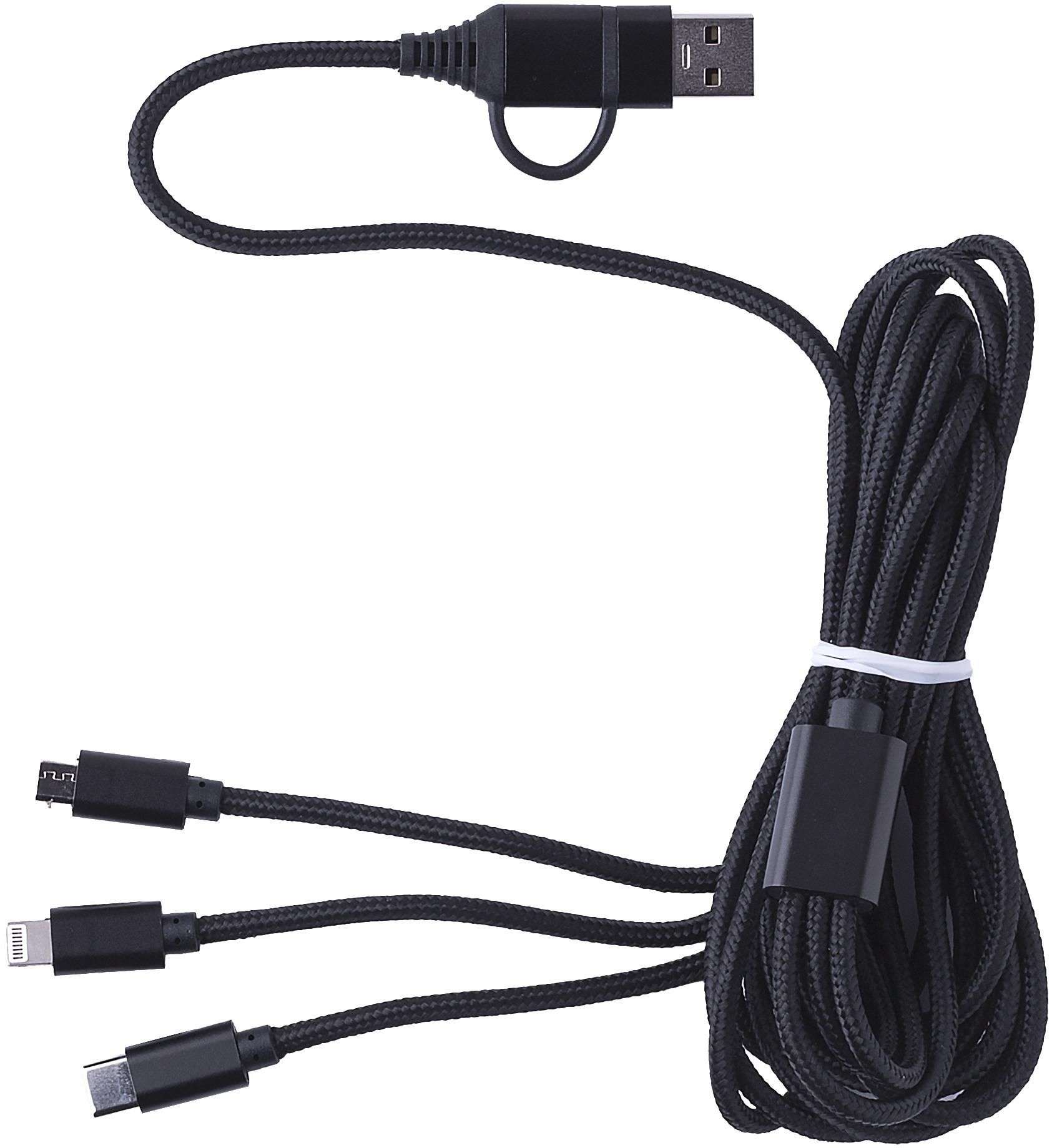 Cavo per la ricarica in nylon, velocià per la ricarcia 1.5 A, comprende connettori A+C, micro, tipo C e lightning, lunghezza del cavo circa 290 cm