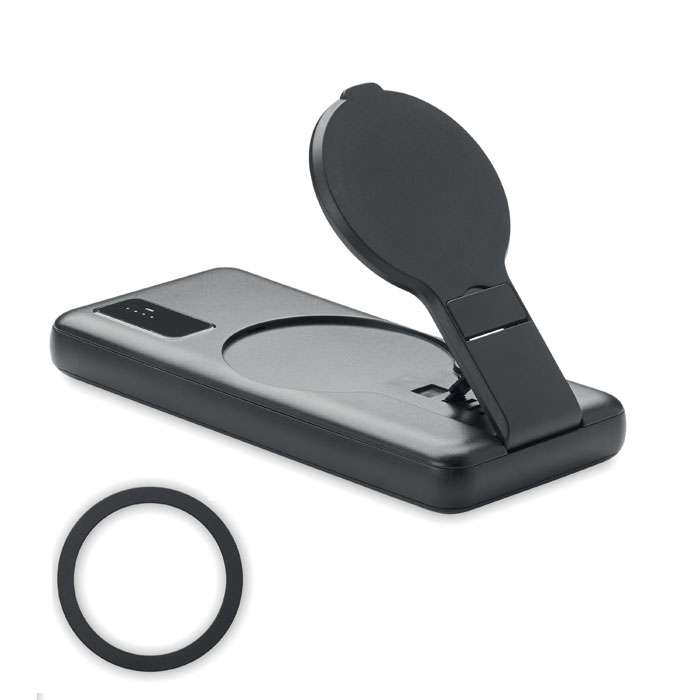 Caricatore wireless magnetico (15W) e p.bank (10000 mAh) con base magnetica per telefono. ABS. In: micro B, Type-C. Output 2x USB-A In/Output: C. Anello magnetico extra. PD power per supportare i laptop di nuova generazione.