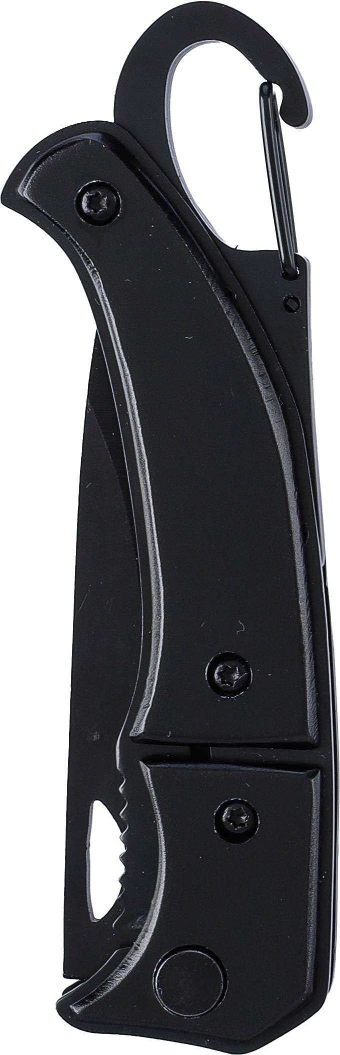 Coltellino tascabile in acciaio inox con blocco di sicurezza, impugnatura in alluminio e moschettone in metallo, confezionato singolarmente in una scatola in cartone avana. Dichiarazione di non responsabilità: moschettone non adatto all'arrampicata.