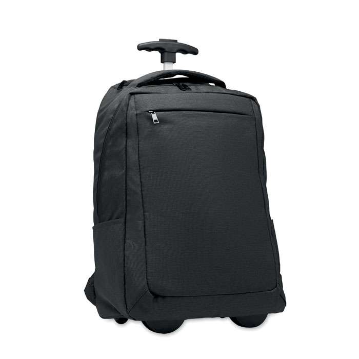 Zaino per laptop con ruote in poliestere 600D RPET. Uno scomparto interno per laptop da 15 pollici. Tasca frontale con cerniera. Due tasche laterali a scorrimento. Tre tasche interne. Schienale e spallacci imbottiti. 2 ruote e telaio a doppio tubo.