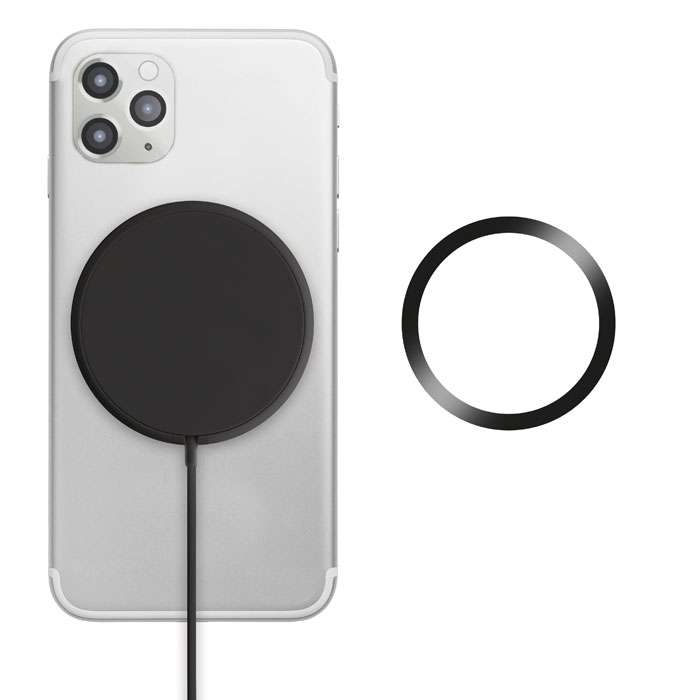 Caricabatterie wireless magnetico in ABS. Uscita: DC 9V/1.1A (10W). Compreso anello metallico magnetico per supportare la ricarica di altri telefoni ricaricabili wireless non magnetici.