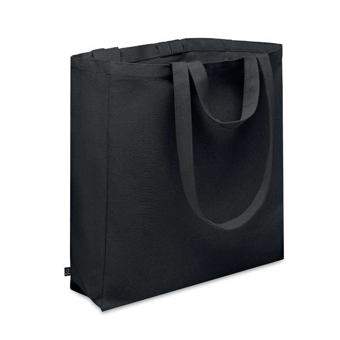 Shopper o borsa mare in policotone riciclato (70% cotone riciclato, 30% poliestere riciclato) con manici corti. Ha una tasca laterale con cerniera. 380 gr/m².