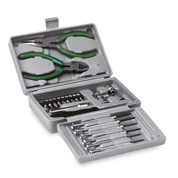 Set attrezzi 25 pezzi in custodia di plastica pieghevole.