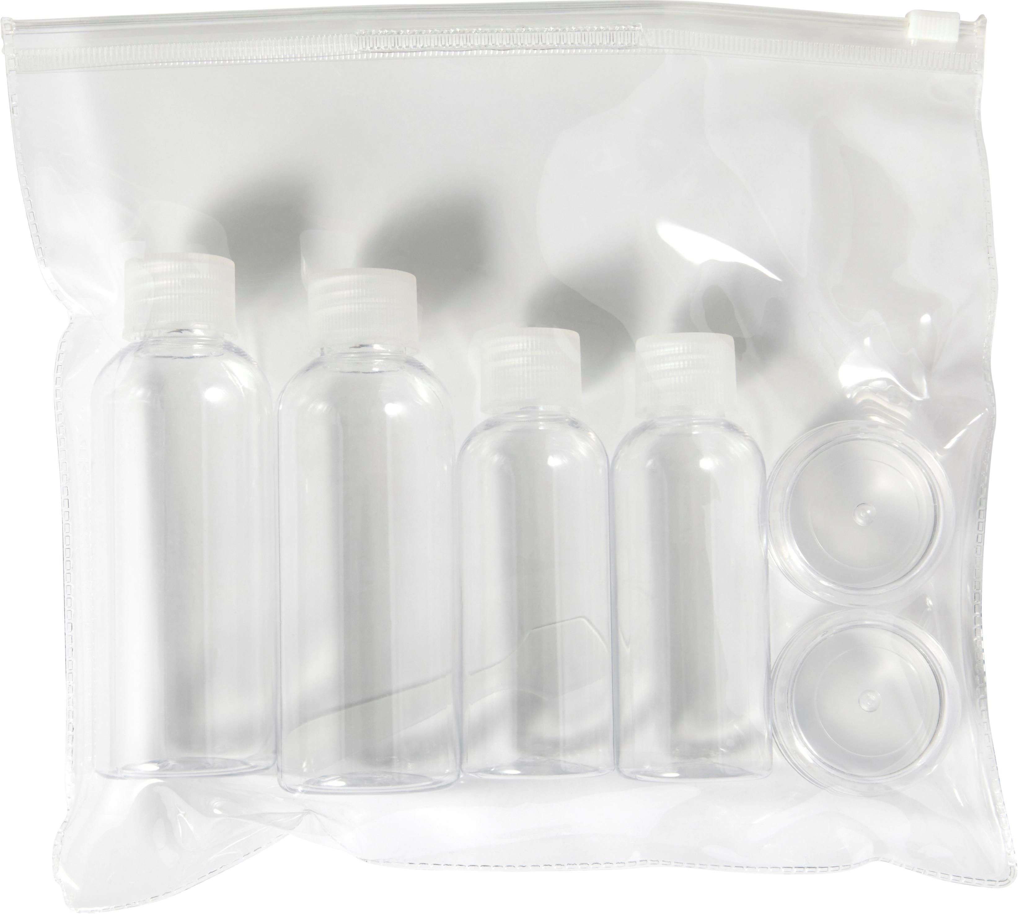 Kit da viaggio per cosmesi, comprende 2 bottiglie da 100 ml, 2 bottiglie da 50 ml, 2 contenitori da 10 ml e 1 paletta, in PETG