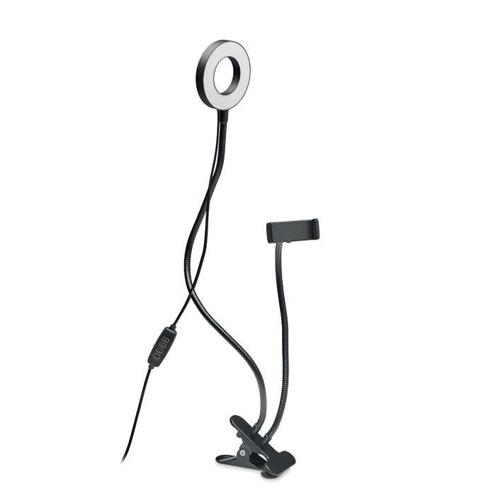 Luce portatile per selfie a LED da 24 cm con supporto per telefono e clip. Ideale per tik-tok®, live-streaming, broadcasting e fotografia. Luce bianca, calda, con 3 livelli di luminosità.
