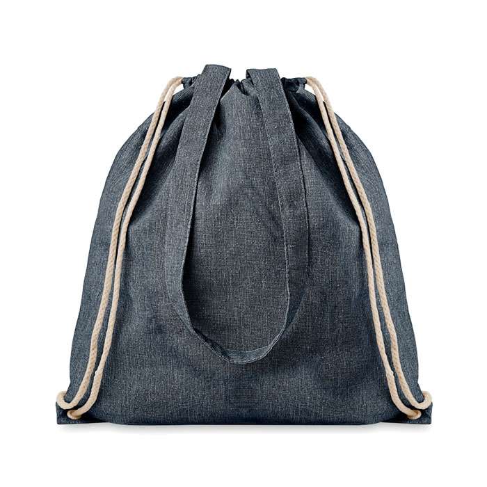 Sacca tono su tono in cotone e poliestere riciclati con coulisse e manici lunghi (20%/80%). Ca.140gr/m². Questo articolo può restringersi dopo la stampa.