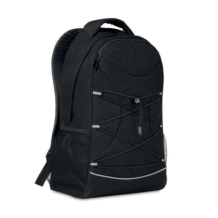 Zaino in RPET 600D con cordini scuri sul davanti e dettagli riflettenti. Tasche laterali in rete.