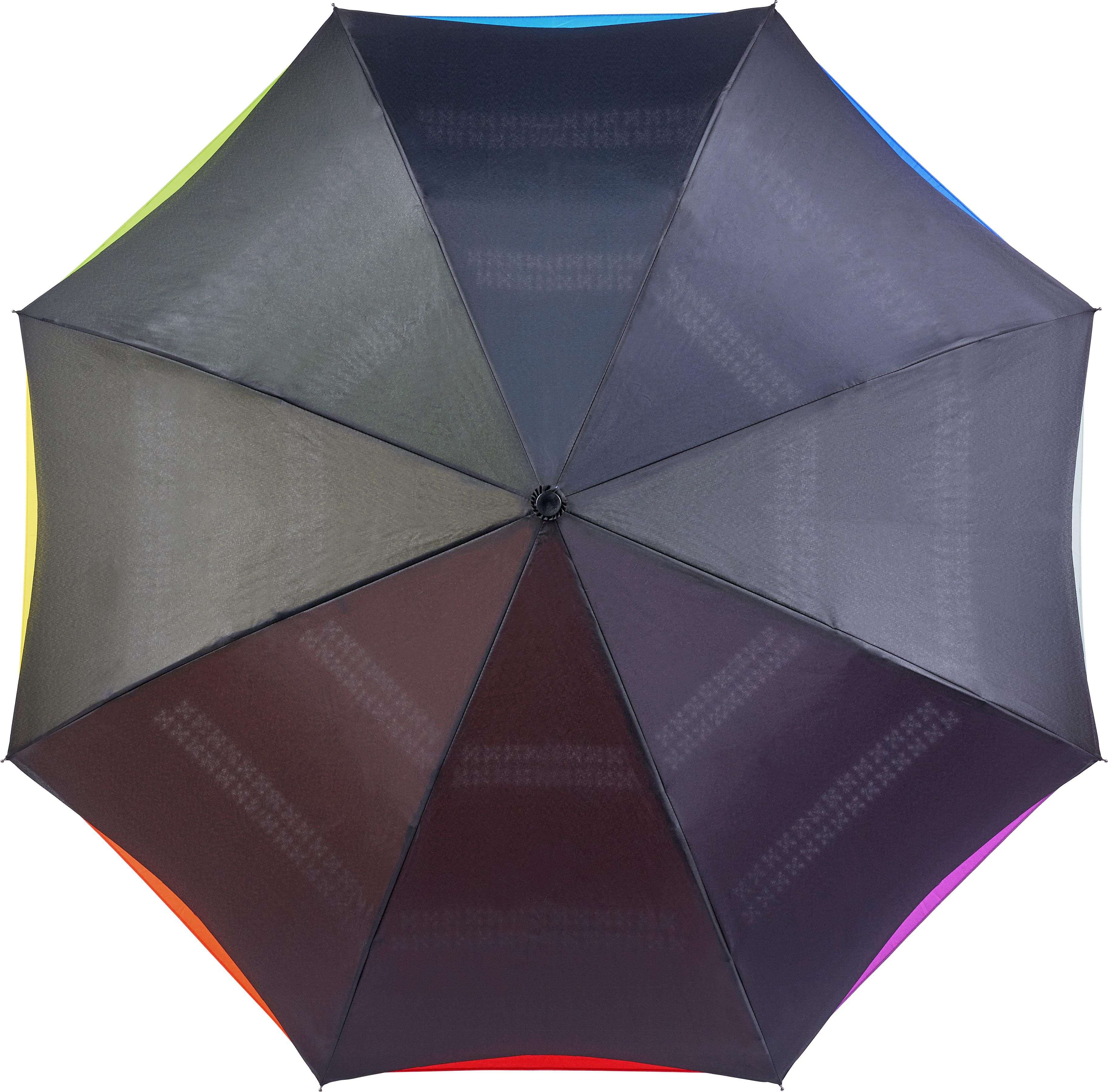 Ombrello reversibile a due strati, superiore in nero ed inferiore multicolore, telaio in metallo con finiture in fibra di vetro, impugnatura in ABS, chiusura in velcro, in pongee 190 T