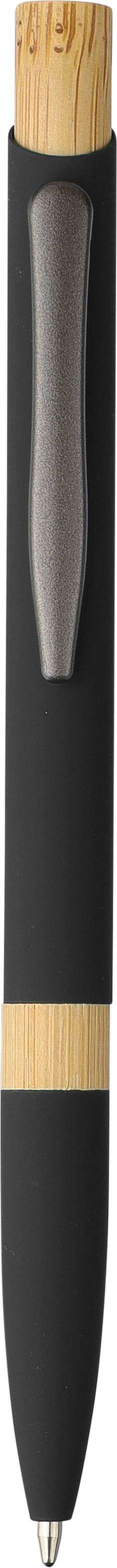 Penna a sfera in alluminio riciclato con finitura gommata, pulsante in bambù e anello in bambù nel corpo. Presenta un meccanismo a pressione, pennino da 1,0 mm e refill blu con una lunghezza di scrittura di circa 800 metri. Include un logo in alluminio riciclato inciso.
