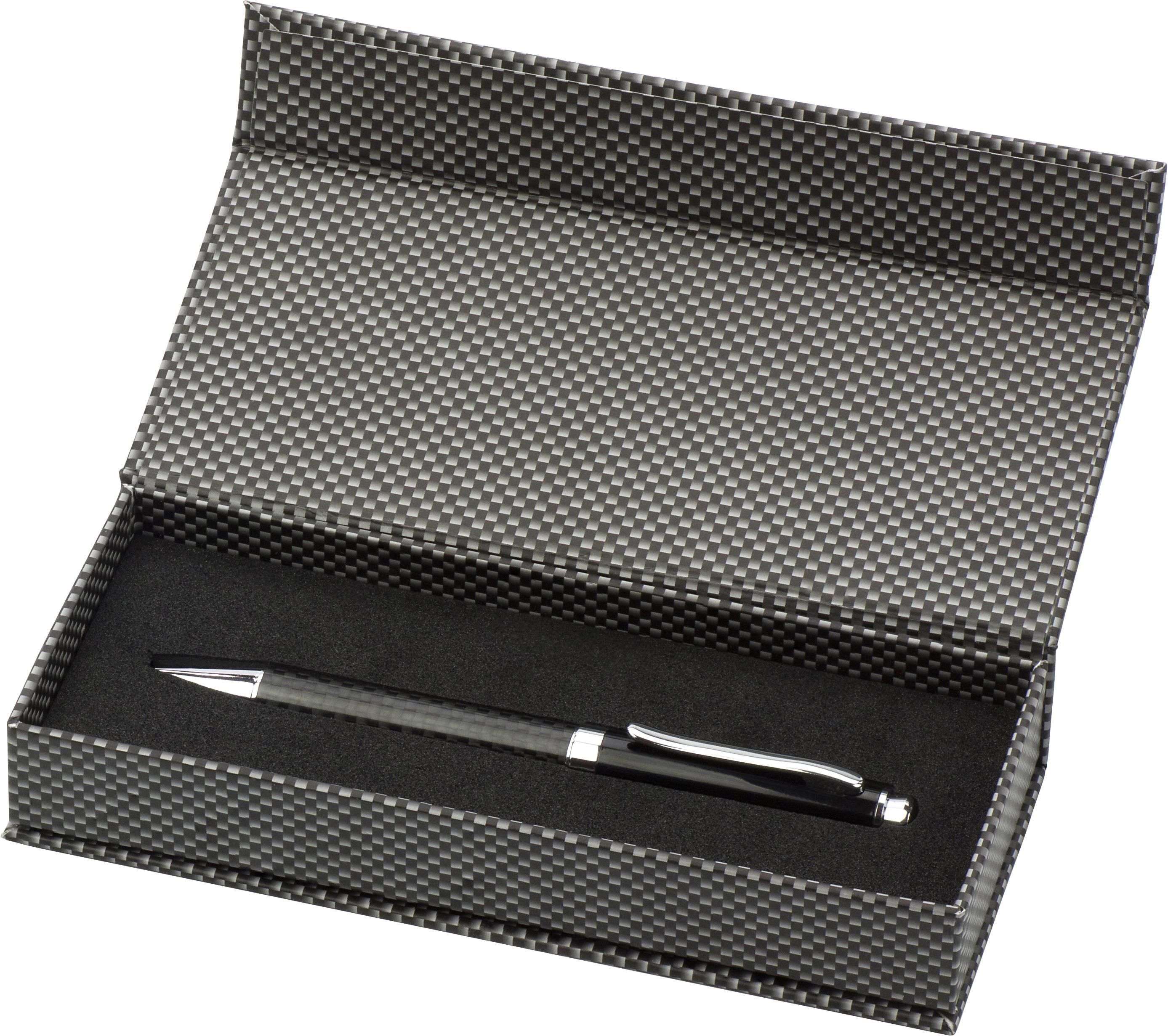 Penna a sfera a rotazione, corpo in carbonio, astuccio in cartone con chiusura magnetica, refill nero