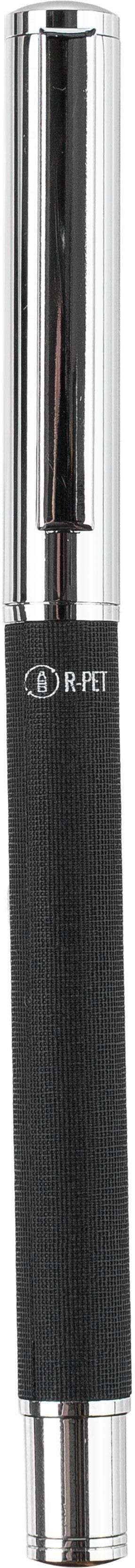 Penna roller rPET in ottone, clip e impugnatura in metallo, logo rPET sul corpo, refill blu, confezionata singolarmente in una scatola di cartone avana.