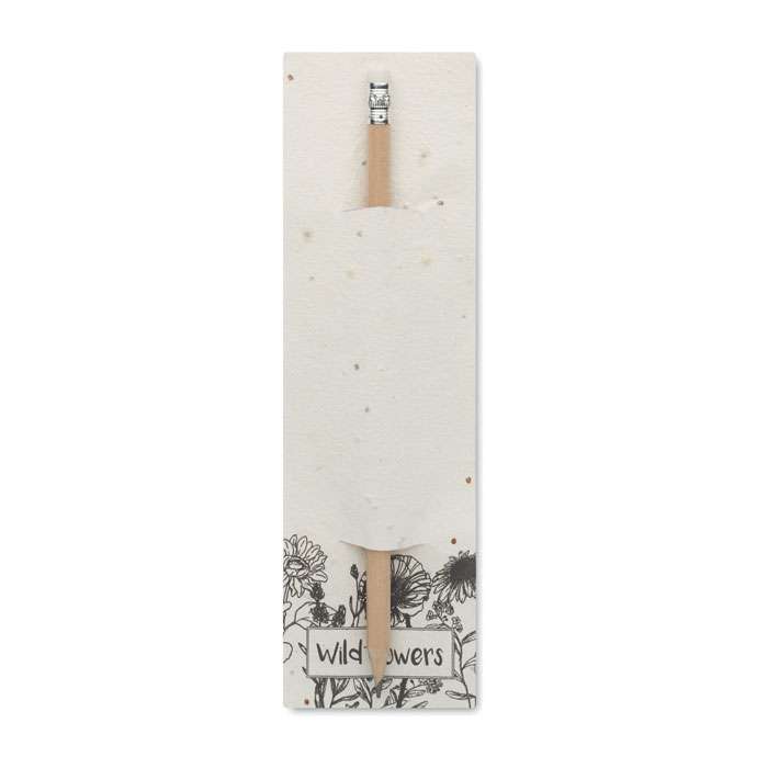 Matita in legno naturale con gomma. Presentata in un astuccio di carta di semi (fiori selvatici).