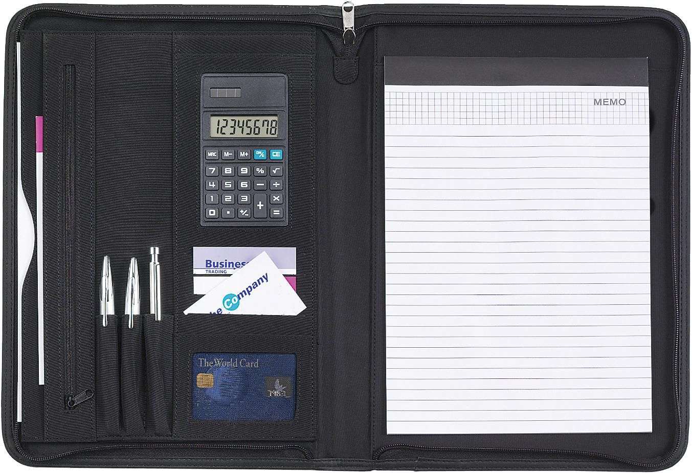 Portablocco formato +/- A4, chiusura lampo, calcolatrice 8 cifre dual power inclusi, targhetta in metallo, blocco incluso, in similpelle