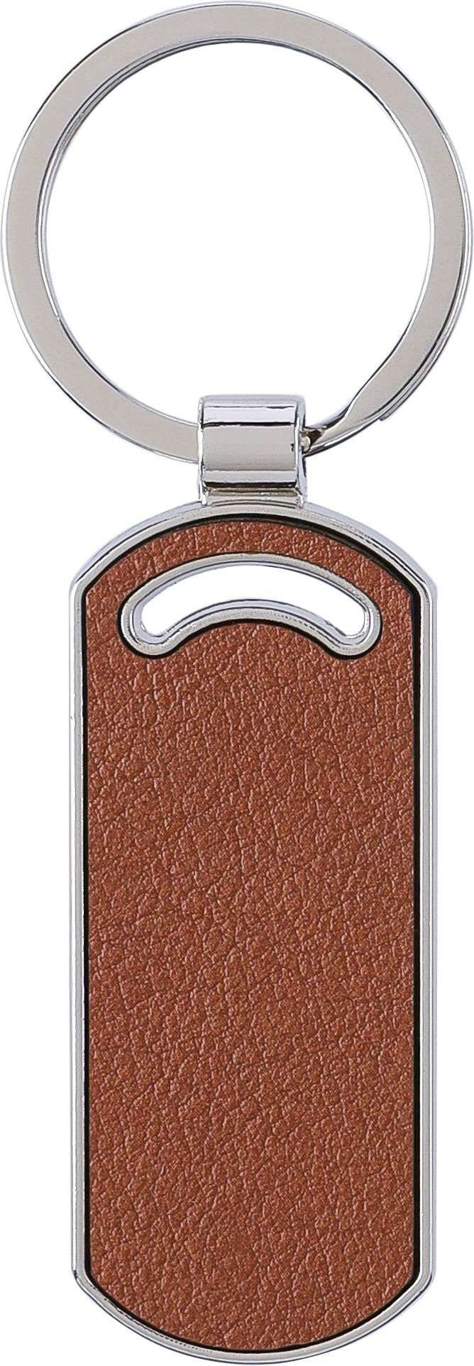 Portachiavi in pelle riciclata a forma ovale, anello in metallo, include goffratura del logo “pelle riciclata” su di un lato, custodia singola in carta marrone