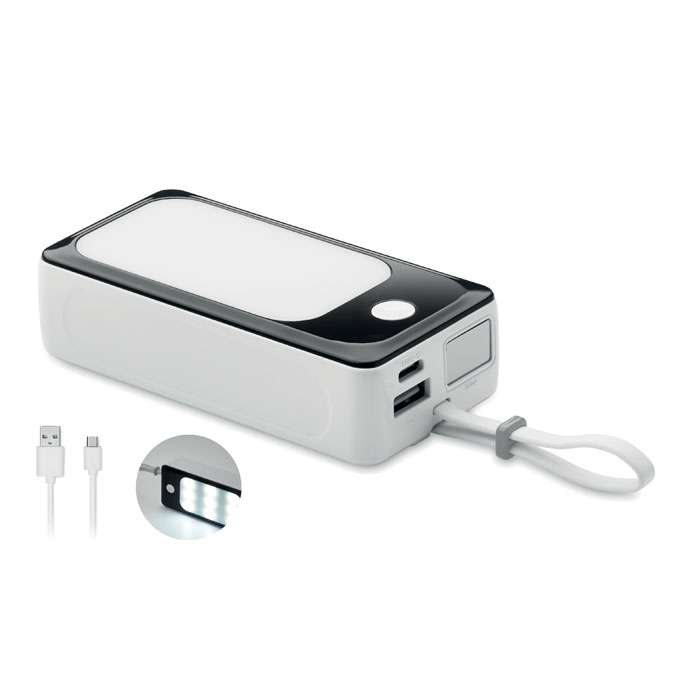 Powerbank da 10000 mAh in ABS. Corrente di uscita DC5V/2A. 4 impostazioni luminose (6 COB led) e il cavo USB integrato con spina di tipo C. Supporto PD 22 ,5W con visualizzazione della batteria.