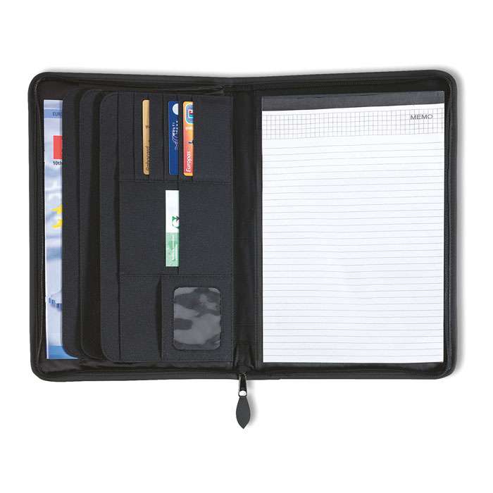 Cartella conferenza A4. Poliestere 600D e fodera in 210T. Con cerniera. Blocco note A4 da 20 fogli a righe in carta riciclata. 4 scomparti. Porta carte incluso.