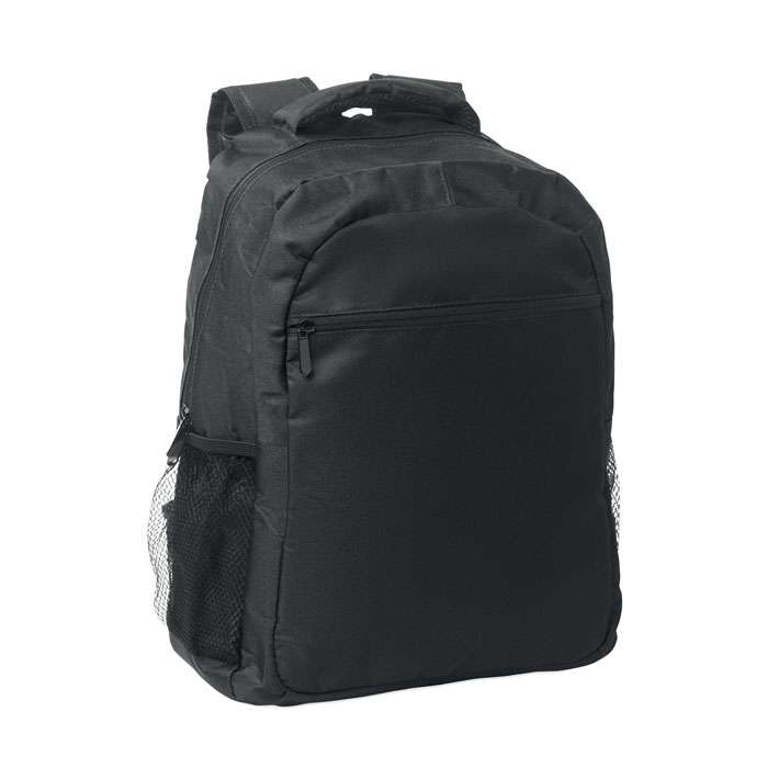 Zaino per laptop da 15 pollici in poliestere 600D RPET con scomparto imbottito per laptop all'interno, tasche in rete su entrambi i lati e tasca frontale con cerniera.