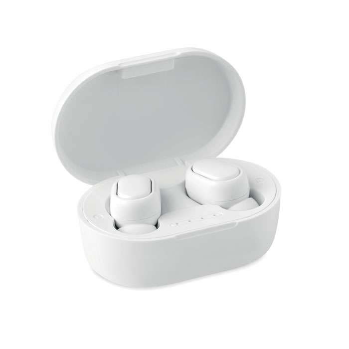 ABS riciclato True Wireless Stereo (TWS) 5.3 auricolari stereo wireless con microfono e batteria da 40 mAh integrata. Durata di riproduzione di circa 4 ore. Associazione automatica. Include un cavo di ricarica micro USB e una stazione di ricarica da 300 mAh.
