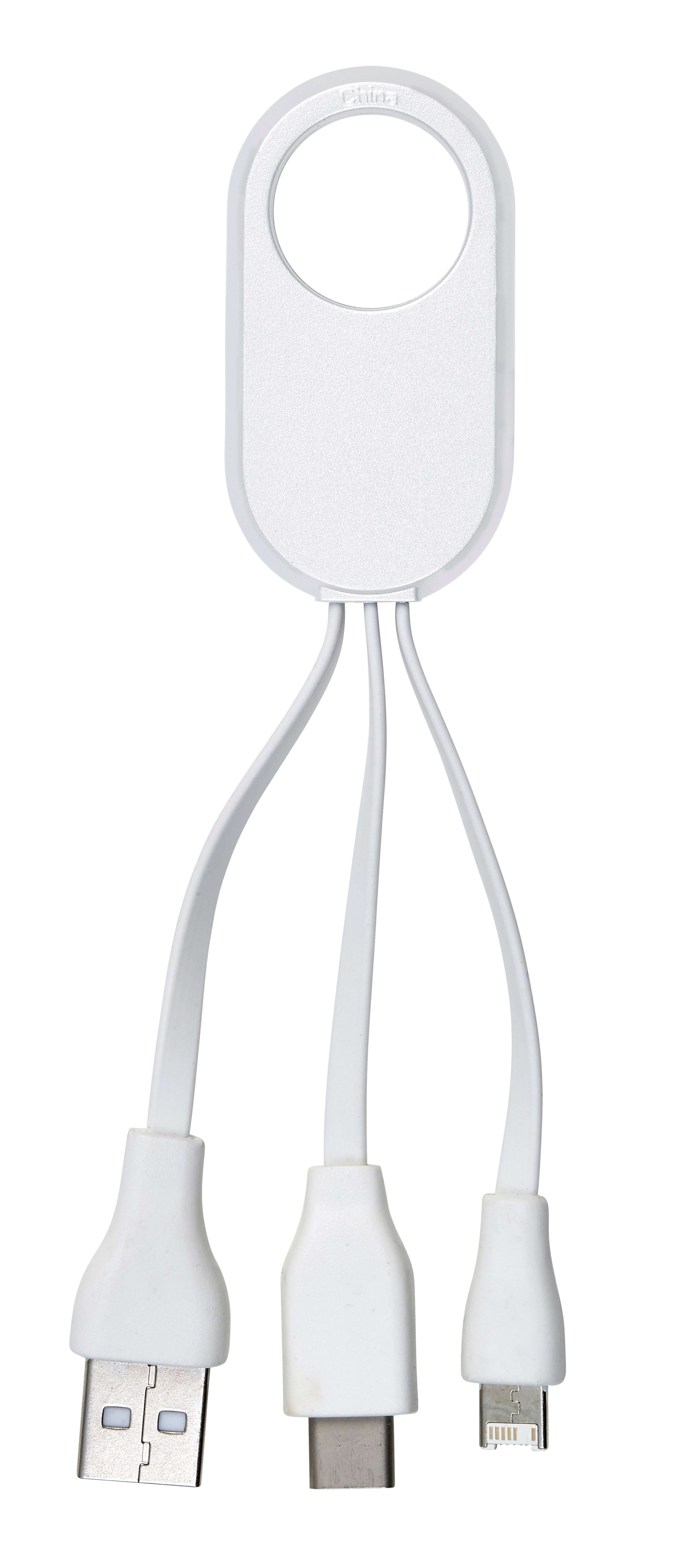 Set cavi per la ricarica, tre plug composti da connettori Type C e doppio Plug micro USB e lightning, lunghezza cavo ca. 5,5 cm, si collega a un supporto ovale con apertura (Ø 1,8 cm)