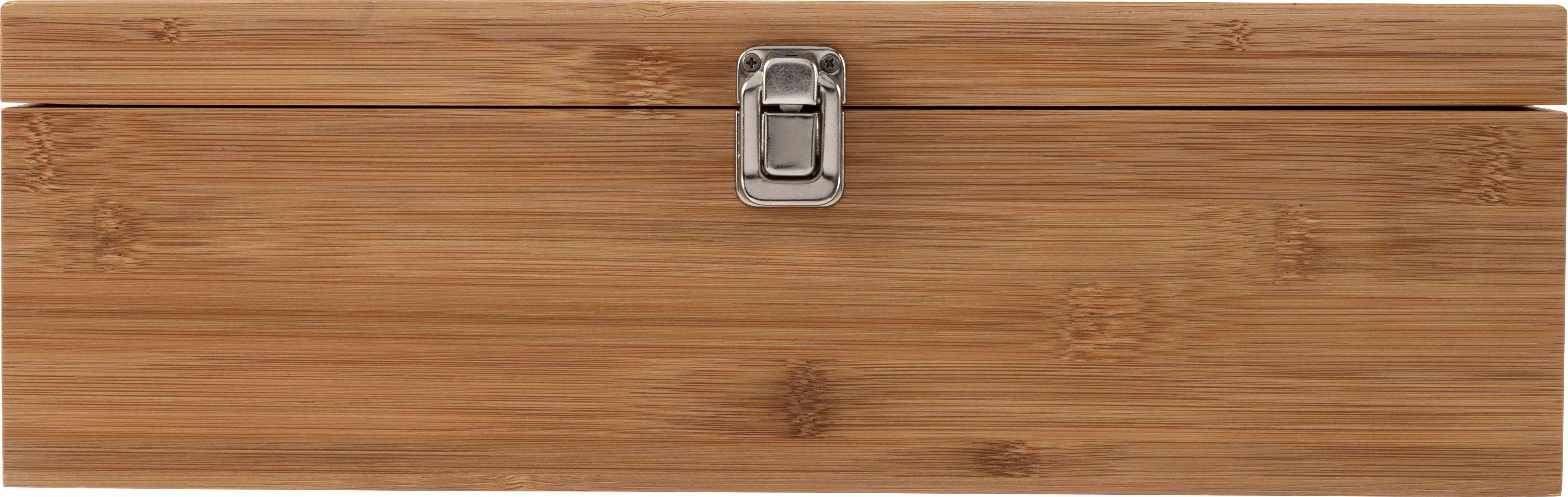 Set vino in bamboo ed acciaio inox, composto da 4 accessori: anello salvagoccia, beccuccio versatore, tappo e cavatappi, confezione regalo