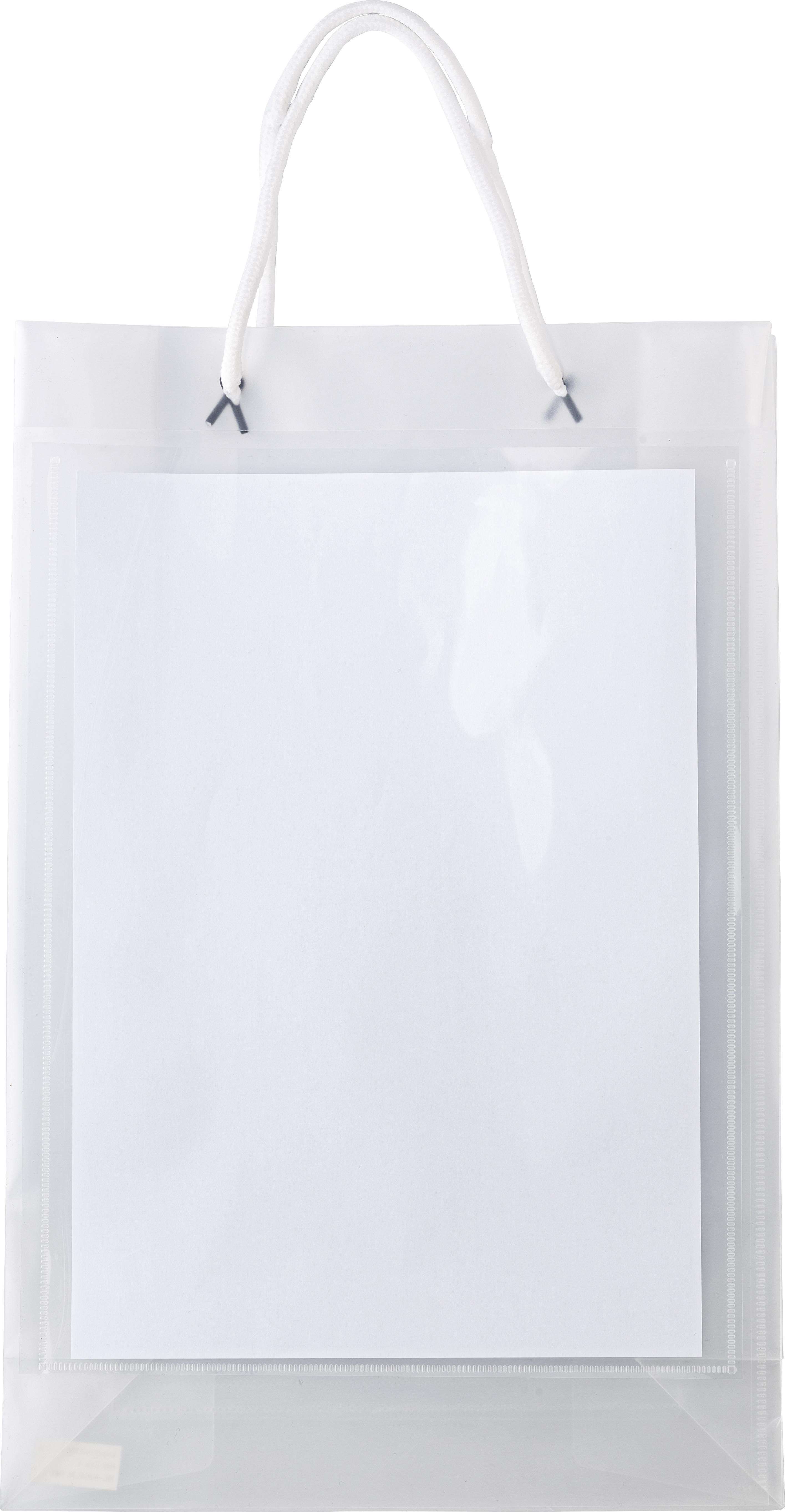 Shopper grande, tasca laterale trasparente da utilizzare per inserire cartoncino personalizzato, con manici in corda, in PP