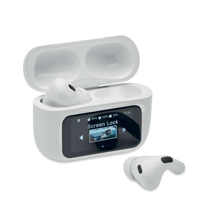 Auricolari stereo True Wireless Stereo (TWS) 5.0 in ABS (30 mAh) con ANC/ENC, microfono e base di ricarica da 230 mAh. Display touch screen.