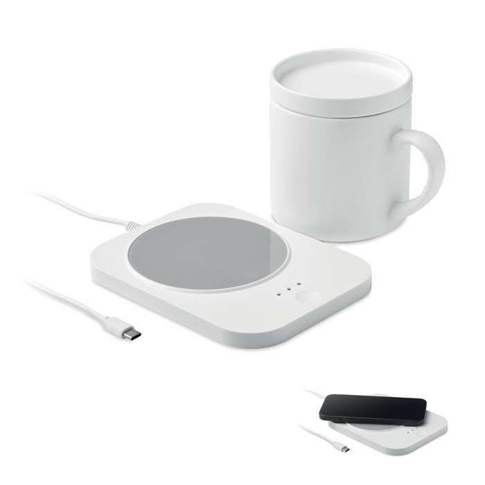 Caricatore wireless 2 in 1 da 15W e scalda tazza in ABS. Mantiene le bevande calde fino a un massimo di 50ºC. 3 impostazioni di temperatura con touch screen. Cavo di collegamento USB. Uscita: DC 9V/1,67A (15W).