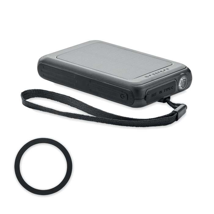 Caricatore wireless magnetico (5W) Power bank 5000 mAh in ABS e pannello solare. Uscita: DC 5V/2A. Compatibile con iPhone® 12 e successivi. Incluso anello metallico magnetico aggiuntivo.