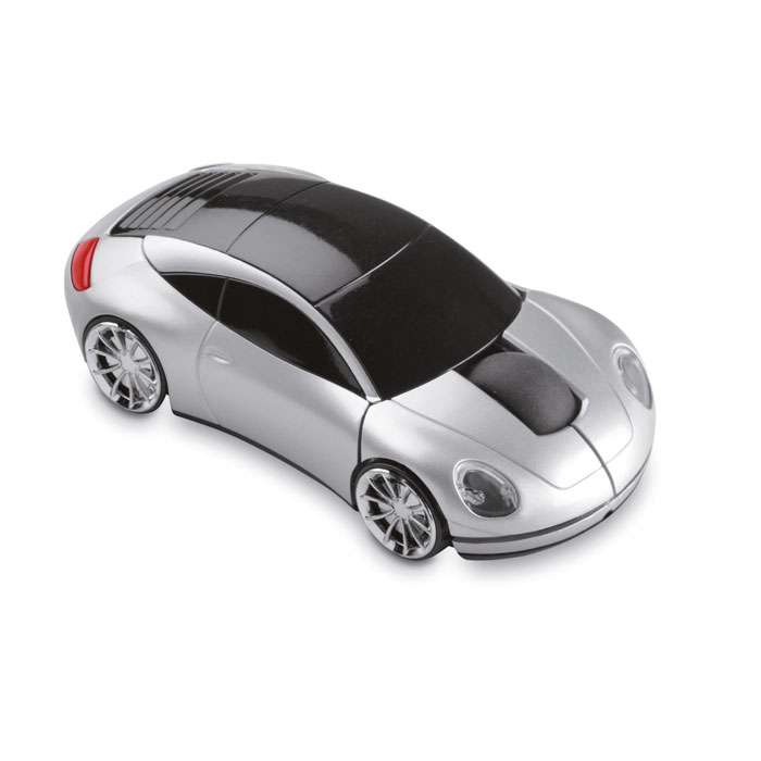 Mouse wireless a forma di automobile. 800dpi. Realizzato in ABS con rifiniture nero lucido e argento. 2 batterie AAA non incluse.