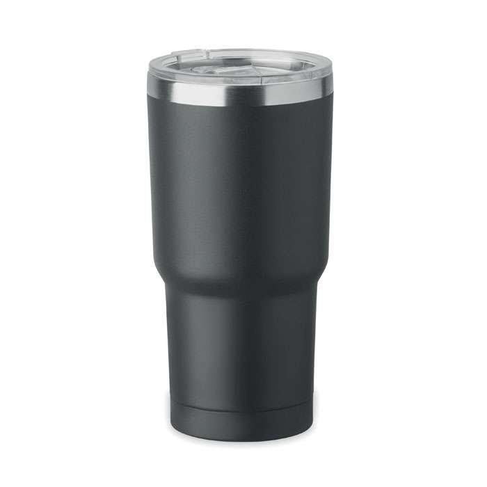 Bicchiere in acciaio inox riciclato a doppio strato (90% acciaio inox riciclato e 10% acciaio inox). Coperchio con foro scorrevole per bere. Anti-goccia. Capacità 500 ml.
