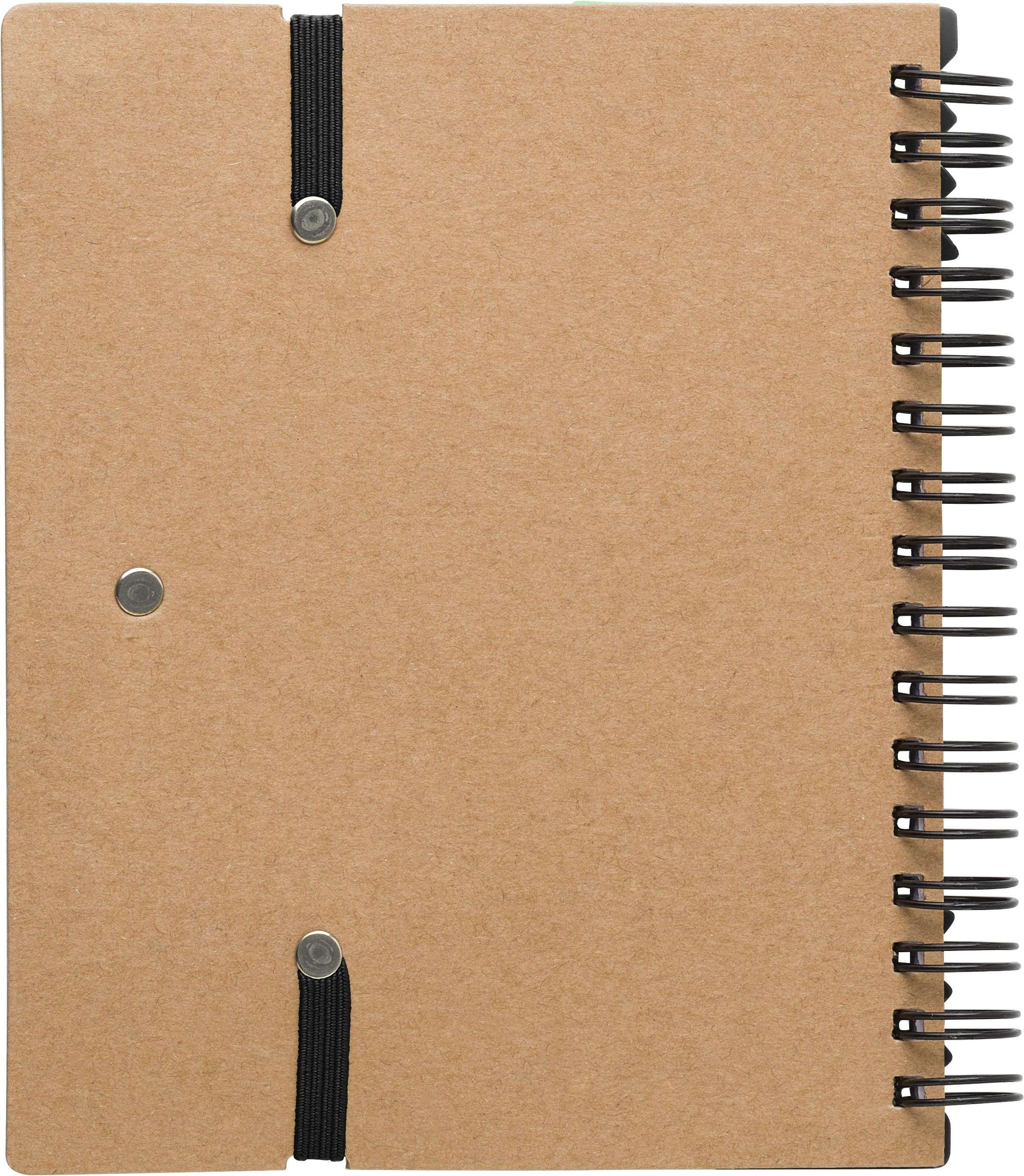 Taccuino in carta riciclata, rilegato a filo con pagine a righe, righello, memo stick in vari colori, penna a sfera, refill nero