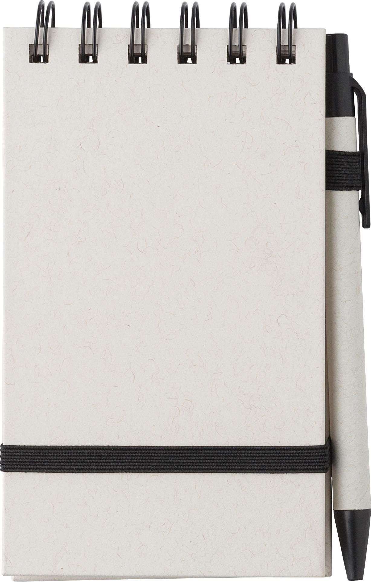 Taccuino in cartone del latte riciclato, 70 fogli, elastico, passante per penna, include penna a sfera con refill blu, realizzato per il 70% in cartone del latte riciclato e per il 30% in carta riciclata, include logo ‘cartone del latte’ stampato a caldo sul retro della copertina