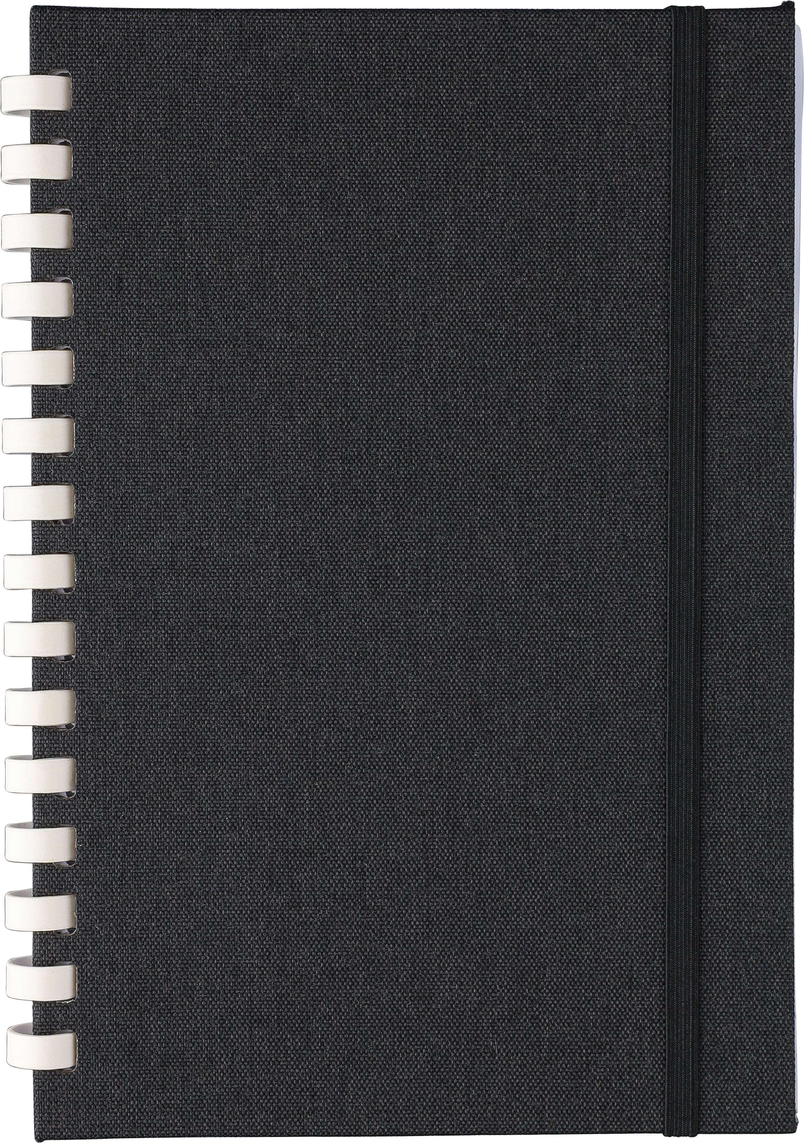 Taccuino in rPET, formato +/- A5, copertina rigida, include elastico per la chiusura, spirale in cartone bianco con 15 anelli, segnalibro a nastro e 80 fogli di carta a righe da 70 g/m². Presenta logo rPET sul retro, confezionato in carta velina, senza polybag.