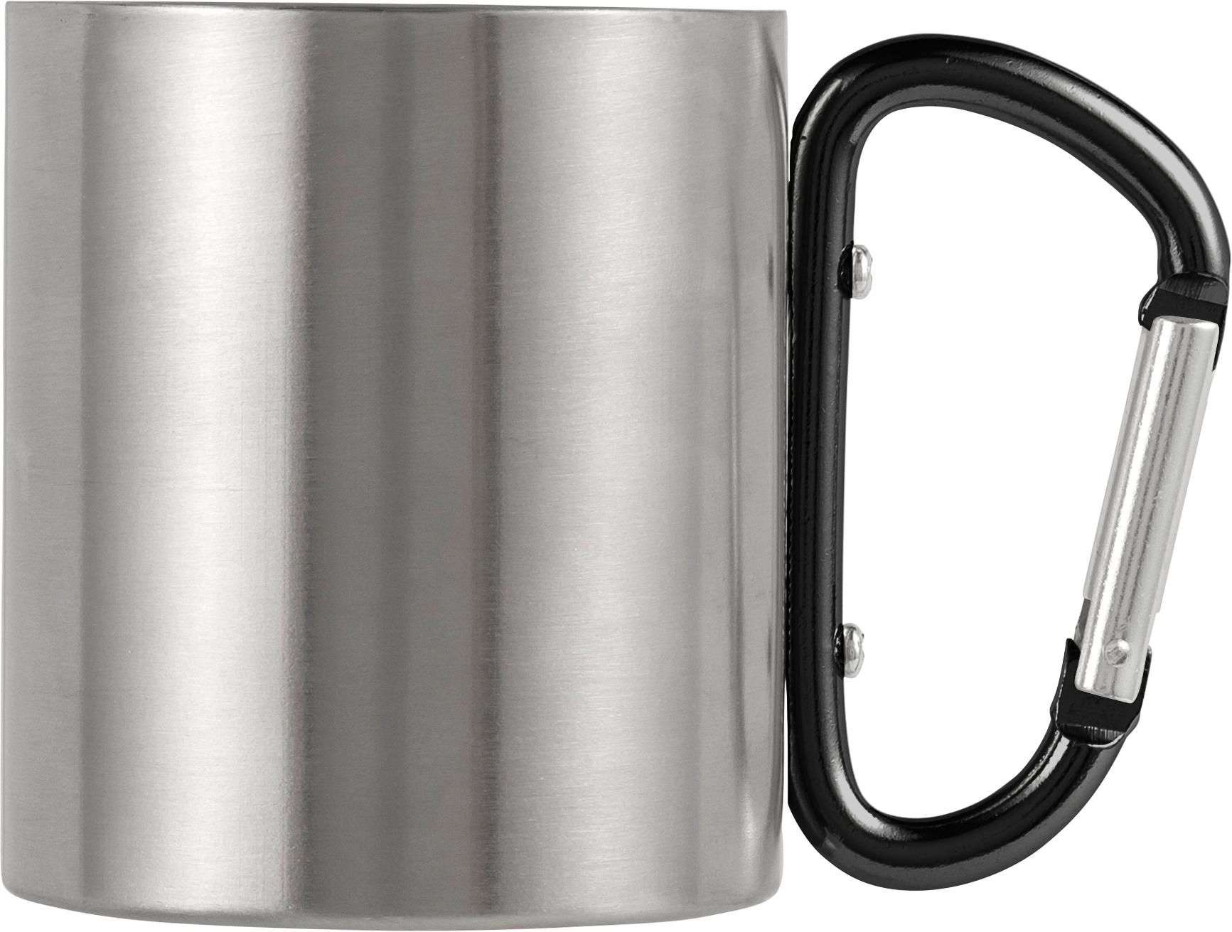 Tazza da viaggio in acciaio inox, doppia parete, l'impugnatura funge anche da gancio a carabina, capacità 185 ml