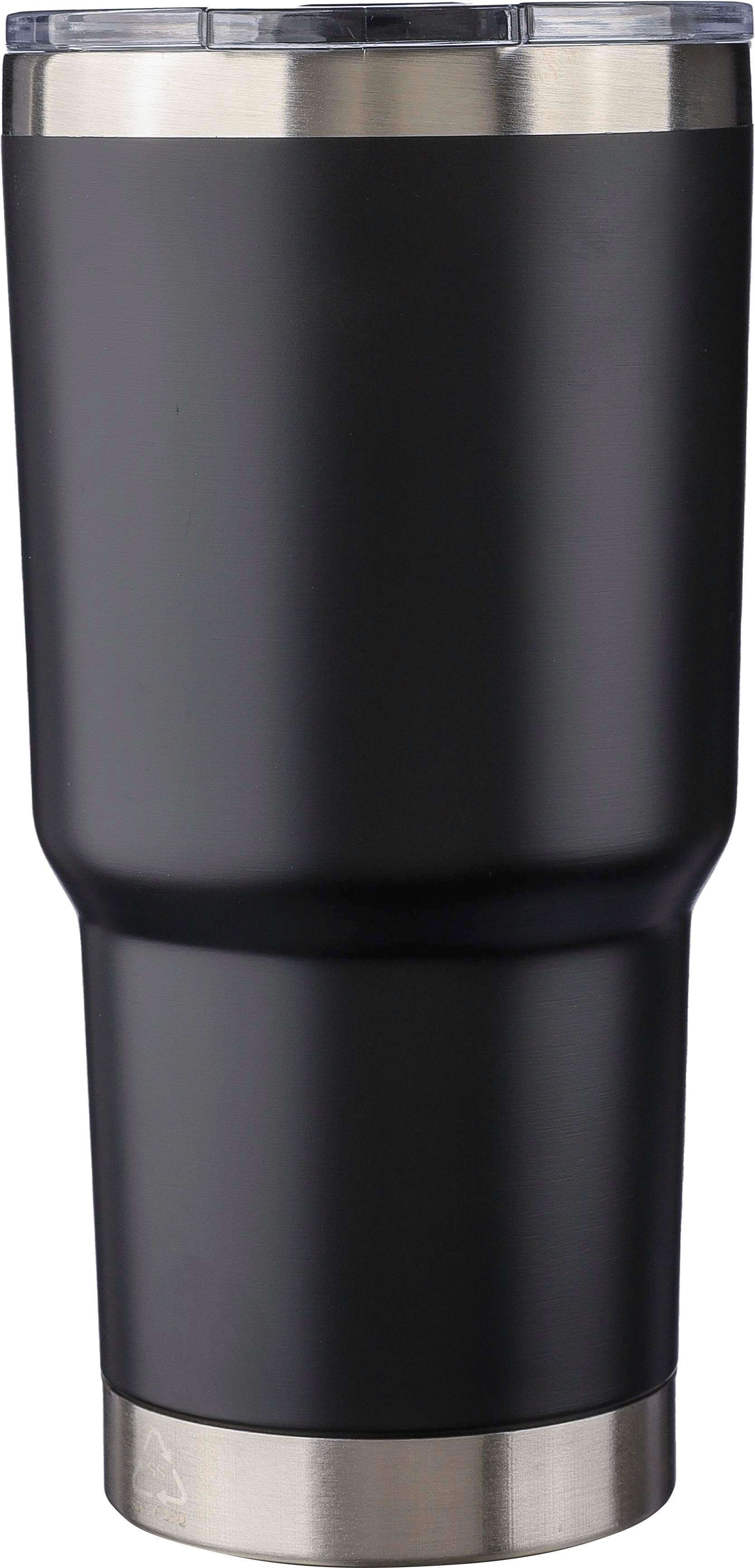 Tazza in acciaio inox 304 (esterno acciaio inox 201), doppia parete, coperchio in PS, logo ”acciaio inox riciclato” sul lato anteriore della tazza, confezionata singolarmente in una scatola in cartone avana, capacità 590 ml
