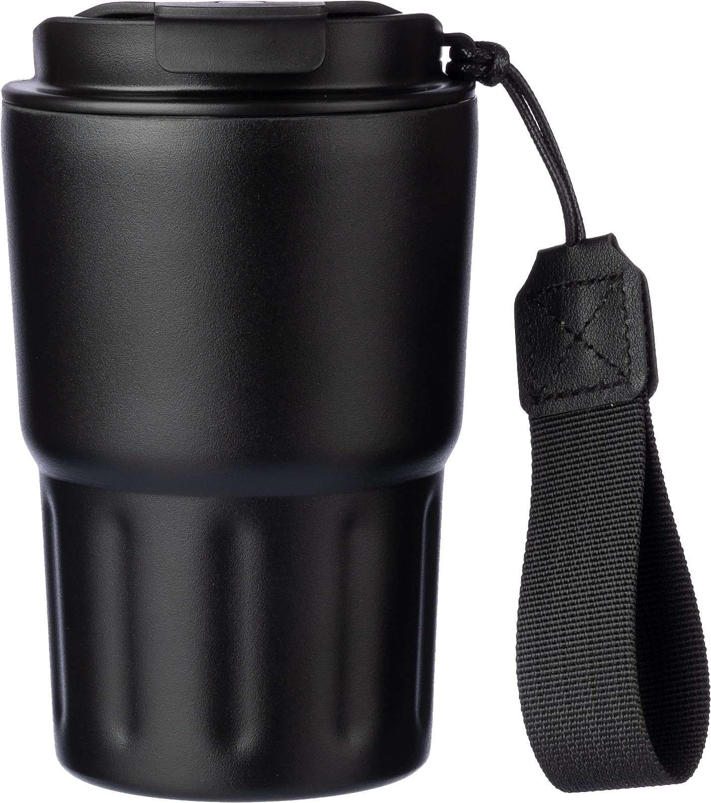 Tazza termica in acciaio inox a doppia parete, rivestimento a polvere, interno in acciaio inox 304 ed esterno in acciaio inox 201, cordino per il trasporto laterale, coperchio in PP, confezionata singolarmente in una scatola in cartone avana, capacità 320 ml