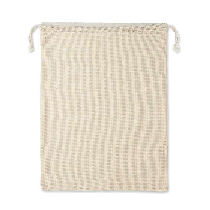 Rete in cotone riutilizzabile. Un lato in cotone da 140gr e l'altro in rete (cotone 110gr). Chiusura con coulisse.