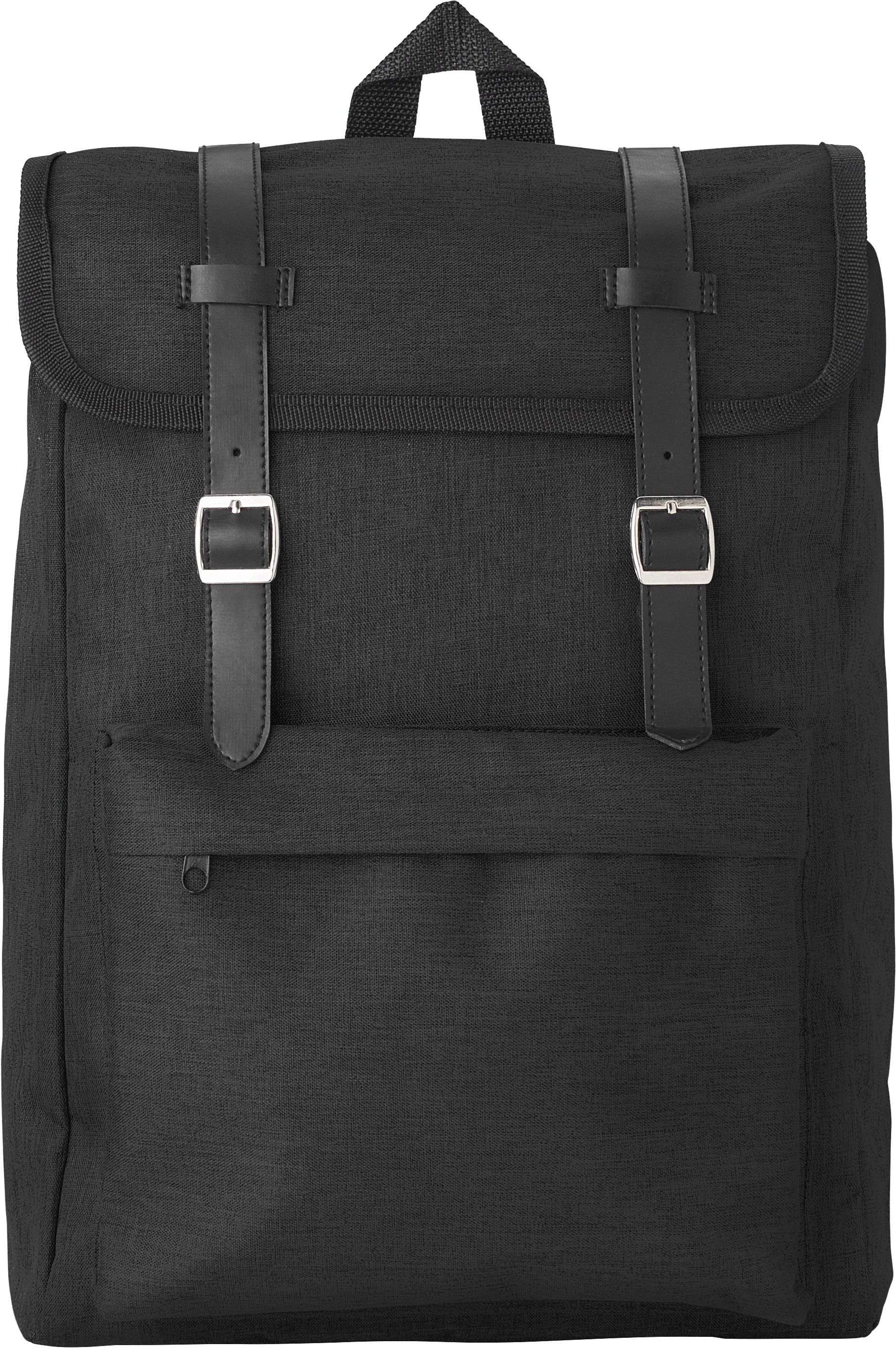 Zaino, ampio scomparto principale, tasca frontale, la patta si chiude con due fibbie metalliche, schienale imbottito, spallacci sono imbottiti e regolabili, in poliestere 210 D